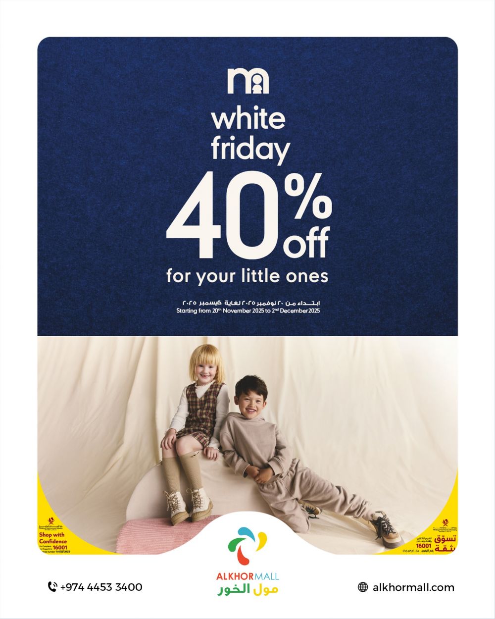 احصلي على خصم ٤٠٪ على تشكيلات ملابس الأطفال الرائعة حصريًا في الخور مول.