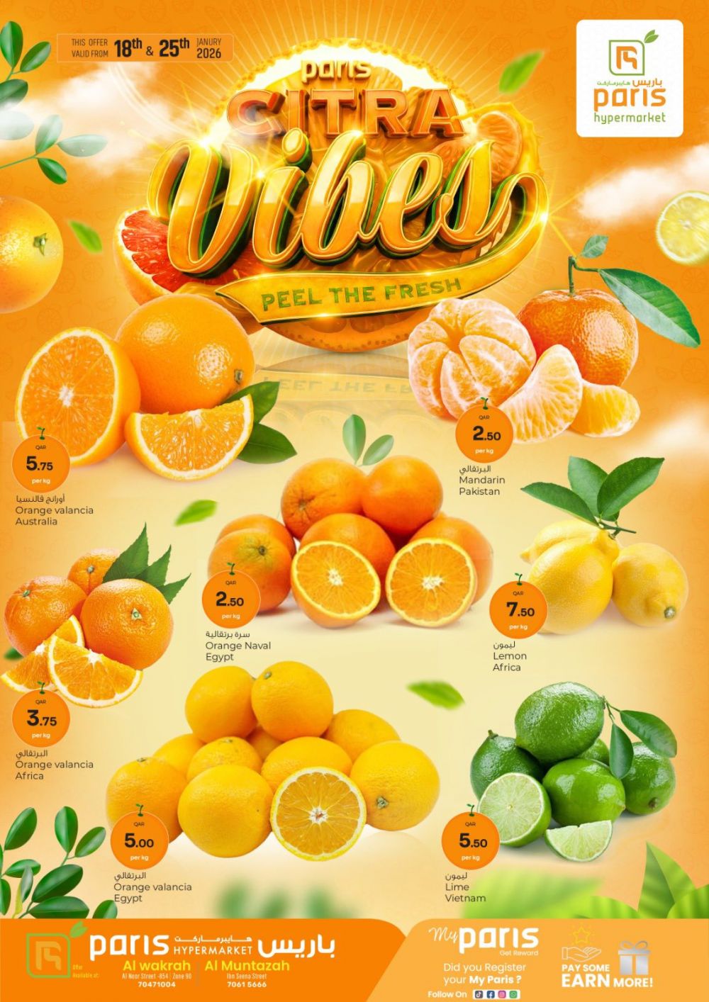 عروض باريس هايبرماركت قطر 2026 اليوسفي والبرتقال والجريب فروت والبوميلو بأسعار مميزة! سيترا فايبز متوفرة الآن في هايبر ماركت باريس ١٨ و ٢٥