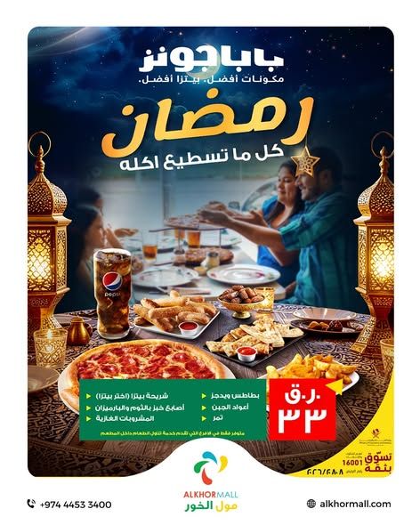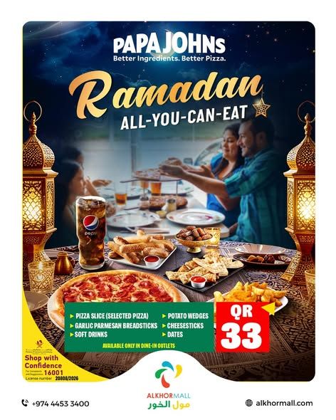استمتعوا بعرض الأكل المفتوح في رمضان لدى بابا جونز قطر بسعر ٣٣ ريال قطري فقط