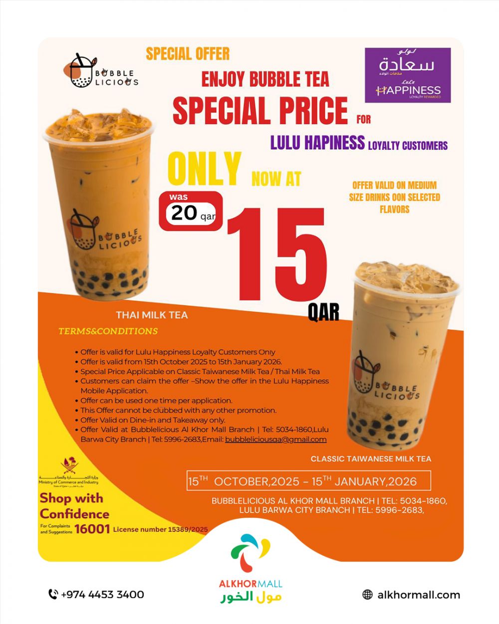 Enjoy Thai Milk Tea or Classic Taiwanese Milk Tea for only 15 QAR — exclusively for Lulu Happiness Members